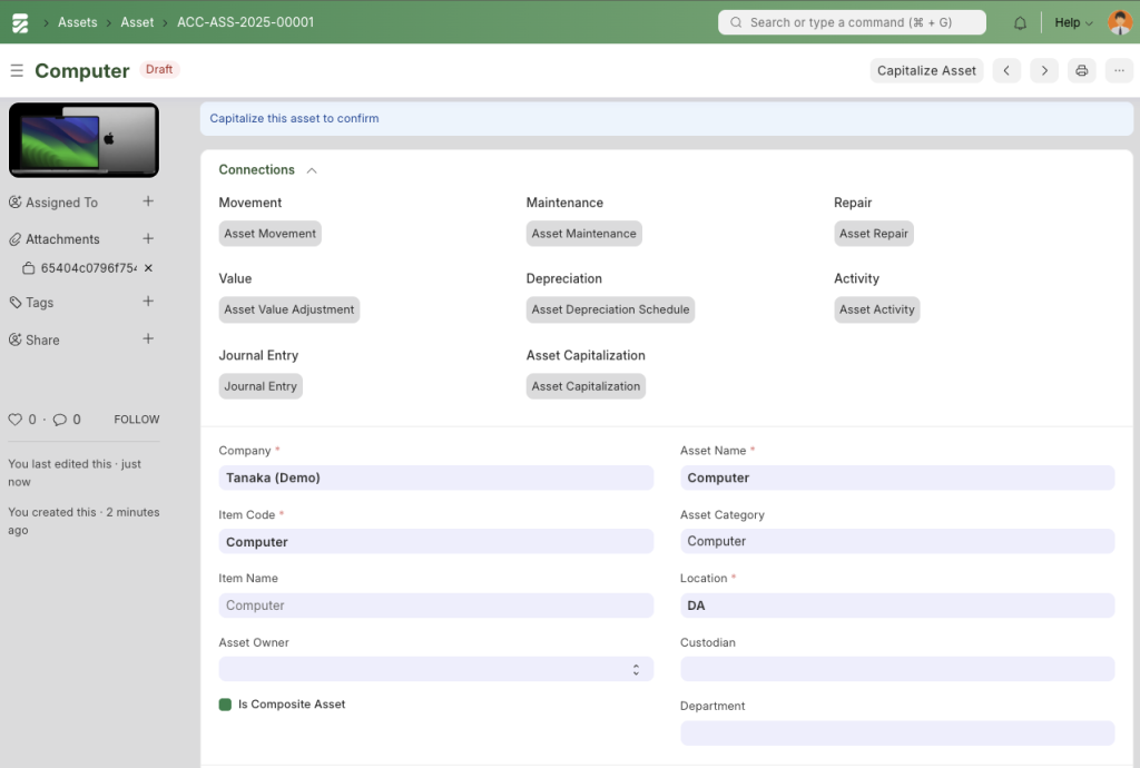 In ERPNext, the Asset record is the heart of asset management module. All the transactions related to an Asset like purchasing, depreciation, maintenance, movement, scrapping, sales will be recorded against the Asset record.