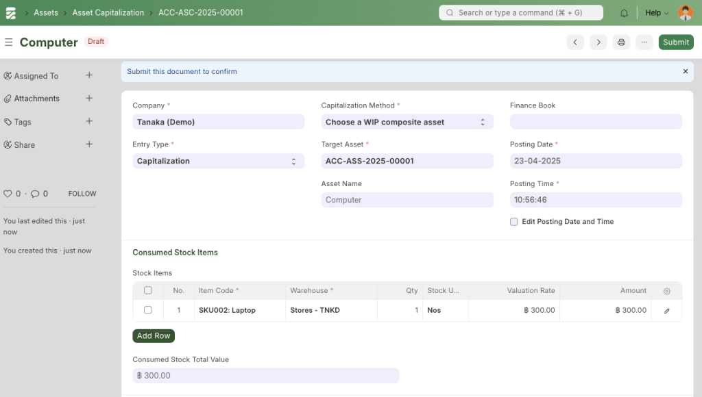 3. Select the Item Code. Item Name and Asset Category will be fetched automatically.