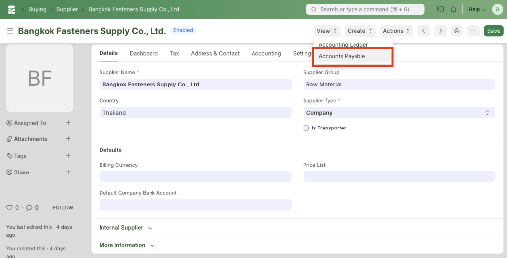Fields in future transactions will be auto-populated if the ‘Default’ fields like Default Bank Account, Default Payment Terms Template etc., are set in Supplier.